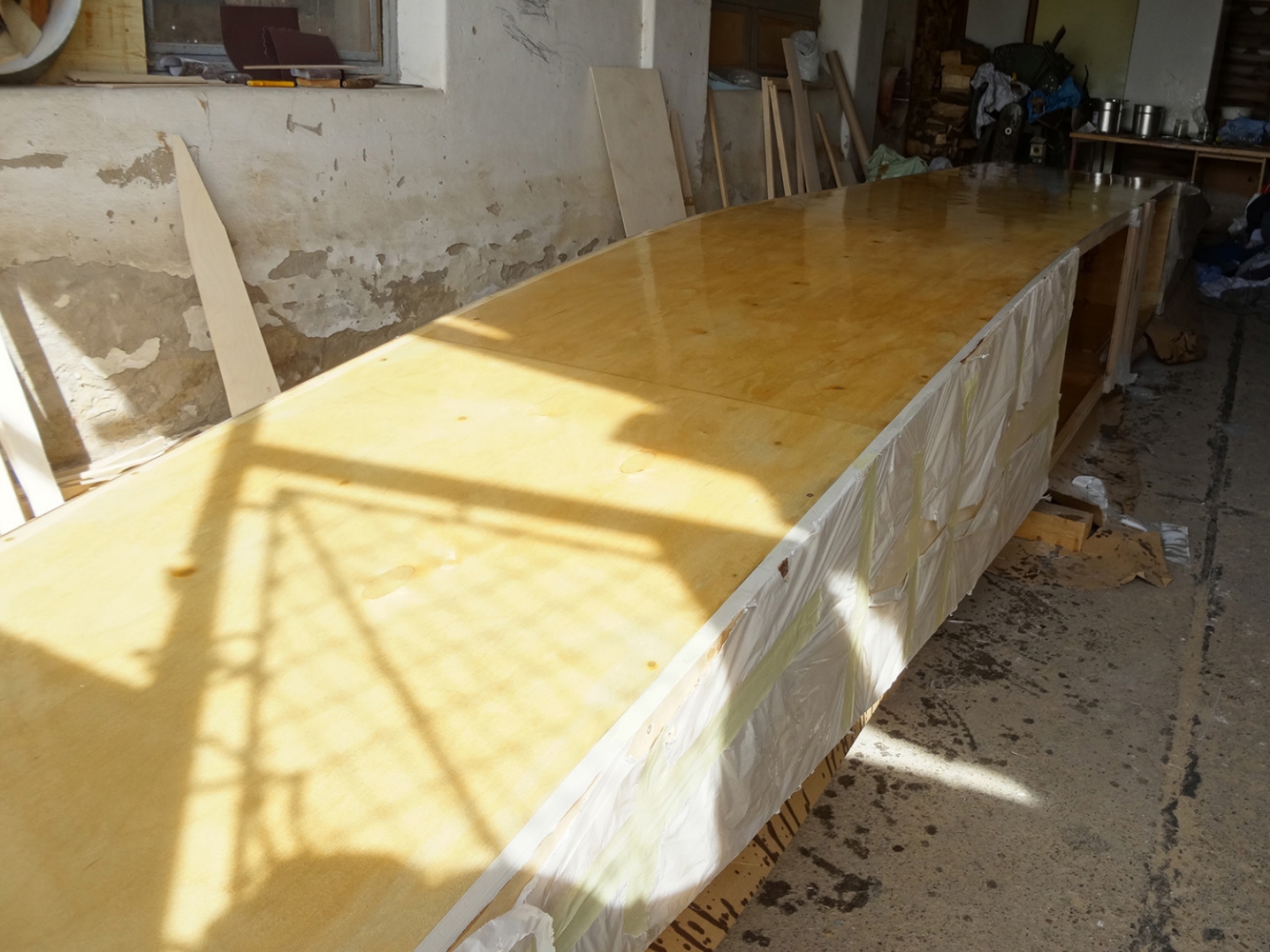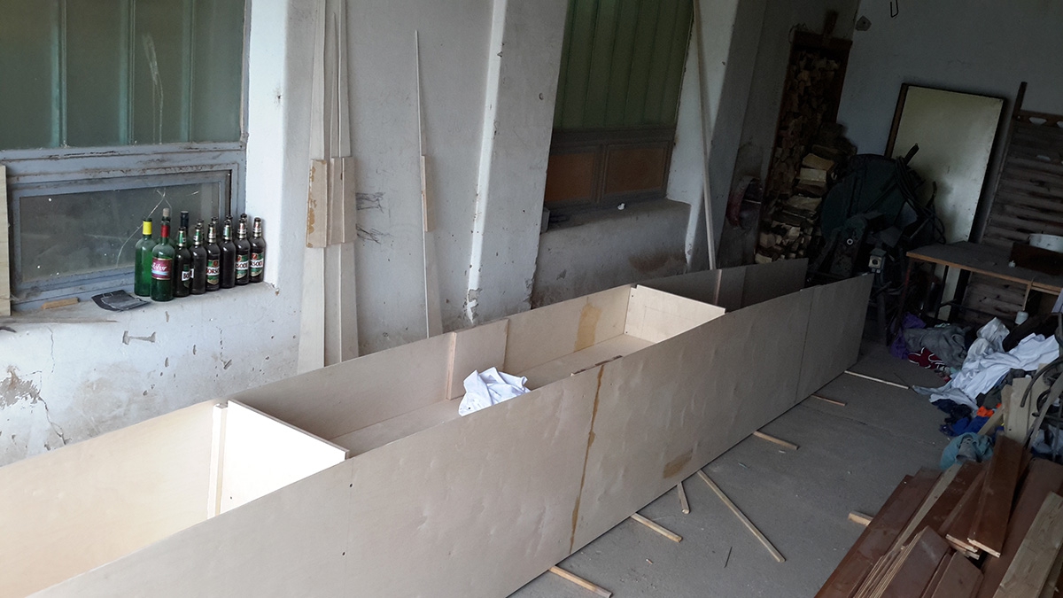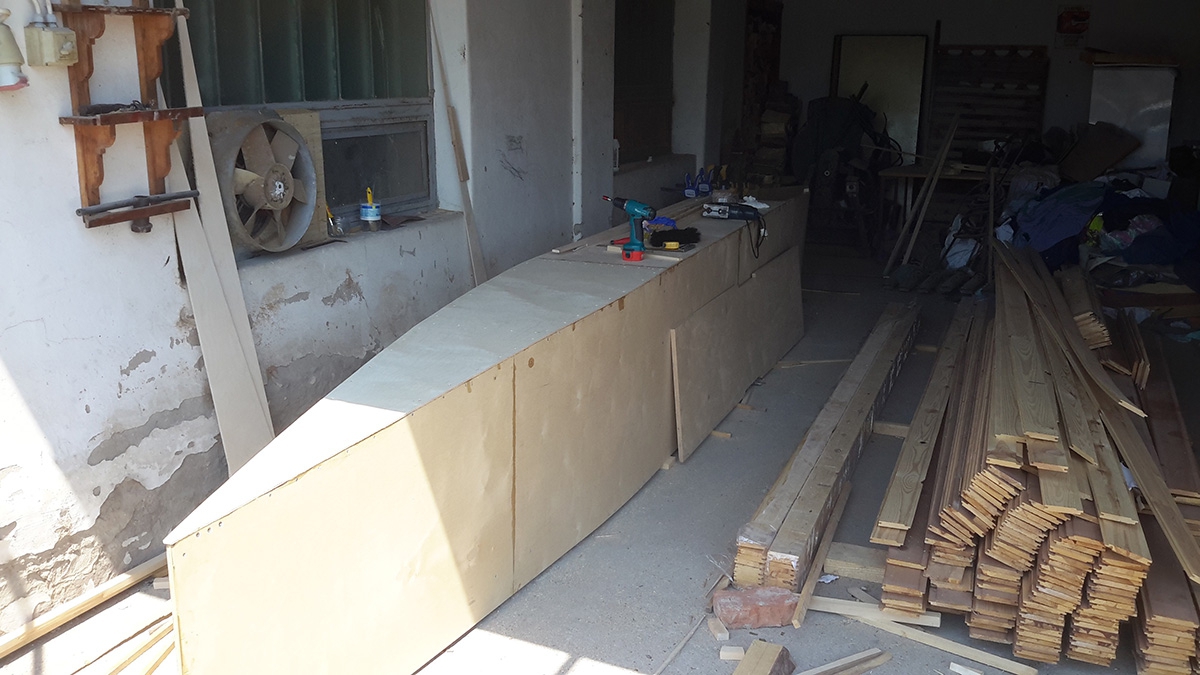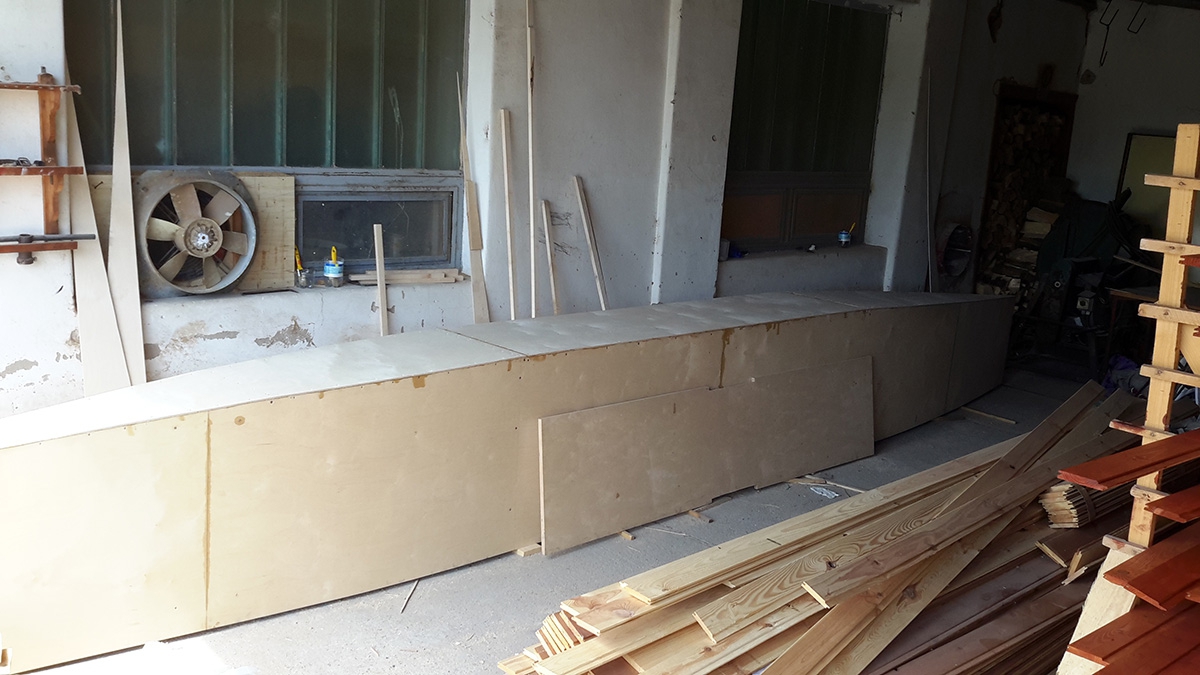 Tavasszal sikerült találnom egy ideális helyet a hajóm építéséhez. A Sár-Bútor Kft. ( http://www.sarbutor.com akiktől nagyon sok önzetlen segítséget kaptam) műhelye mellett egy fiatalkori barátom öccse biztosított számomra fedett, három oldalról zárt helyiséget ahol tudok dolgozni. A Sár-Bútor kft. munkatársai nagyon szívélyesek és segítőkészek az első pillanattól kezdve, mióta meghallották mibe is kezdtem bele. Biztosították számomra a munkálatokhoz szükséges szerszámokat illetve két és négykezi munkával is segítenek mikor az én két kezem kevésnek bizonyul :) Mindhárman kiváló asztalosok így a famunkáknál megfizethetetlen segítséget jelentenek számomra. Bele se merek gondolni hogy a lapszabász és egyéb speciális gépeik nélkül mennyivel nehezebb dolgom lenne, nem beszélve a magas szintű, gyakorlatban megvalósított asztalosipari tudásukról aminek köszönhetően mindig jó tanácsokkal láttak el.