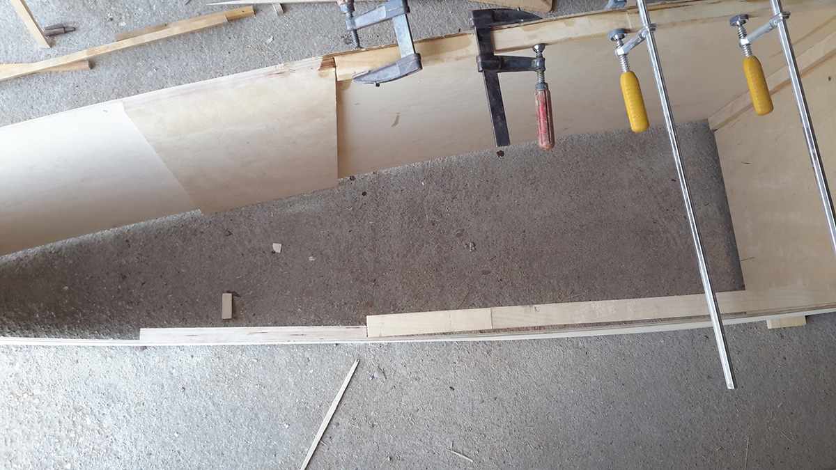 Miután a toldások megtörténtek, a két 7,5x0,8m -es oldalfalat szorítókkal összefogattam majd felrajzoltam és levágtam az orr (és a far) emelkedési ívét. A "wave piercer" orr nem követel akkora emelkedést mint a klasszikus így 2,5m-en 15cm -ben találtam optimálisnak. Persze ez is majd csak a használat közben fog kiderülni mint oly sok döntésem következménye :)