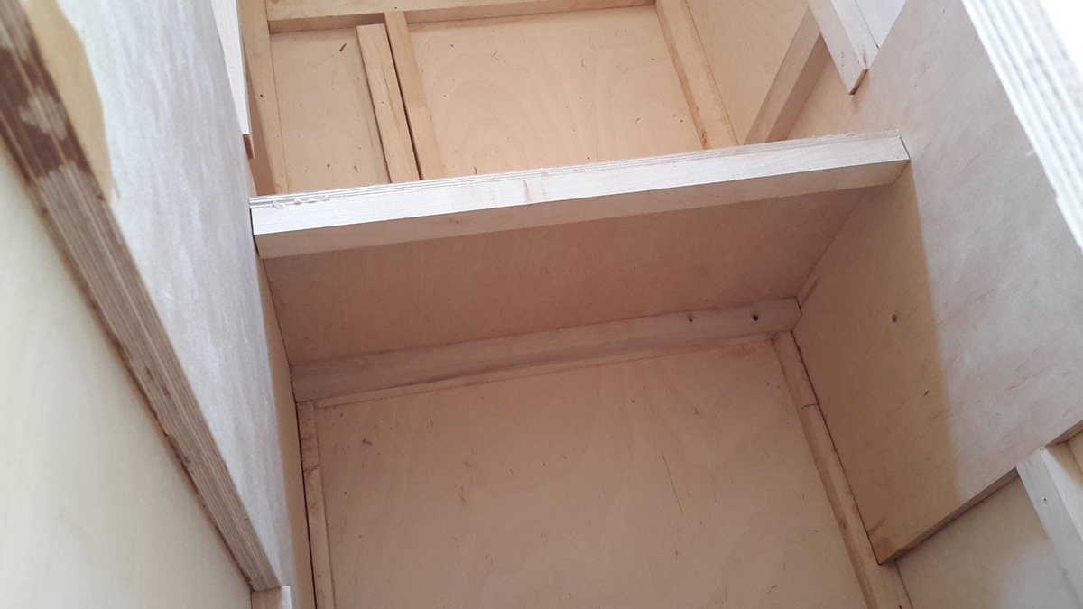 Ebben az építési fázisban is voltak megoldandó technológiai feladatok. Mivel a rétegelt lemezek toldását egy az adott két független tábla mögé átfedéssel beragasztott 18mm vastag rétegelt lemez betéttel biztosítva oldottam meg, ezért a lécek behelyezésénél ezeket a betéteket valahogy ki kellett hagynom, át kellett hidalnom. Erre kétféle megoldás tűnt megvalósíthatónak. Az egyik hogy a lécekbe vágok mélyedést ami felfekszik az átfedő elemre, a másik hogy az átfedő elemeket kihagyva a merevítő léceket annak széleitől indítom el. Végül is mindkét megoldást alkalmaztam a törzs különböző részein. A cikk végén található fotógalériában ezeket is megmutatom.
